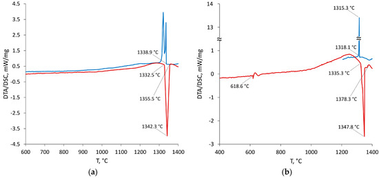 Heat curves from Samples 2 (a) and 6 (b). Red line—heating; blue line—cooling.
