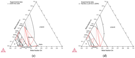 The calculated isothermal sections of the In–Pd–Sn ternary are shown in Figure 7. Good agreement between the calculation results using experimental data on phase equilibria [6] and the results of this study can be noted.