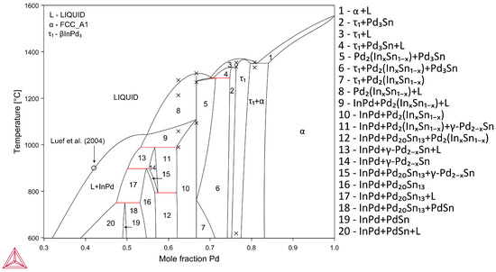 After obtaining the model parameters for the liquid and α phase, other phases were added sequentially: In3Pd, τ1, Pd3Sn, In7Pd3, PdSn2, Pd2(InxSn1−x), Sn20In13, InPd and PdSn.