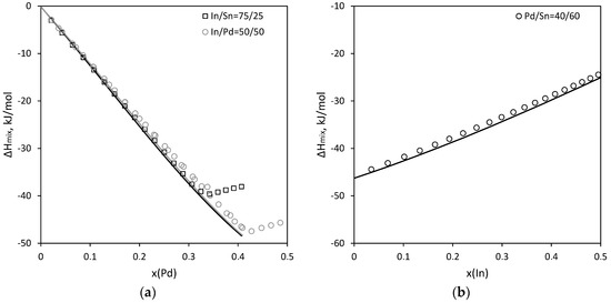 The enthalpy of formation of the melt for sections (a) Pd–In75Sn25 and Pd–In50Sn50; (b) In–Pd40Sn60. Dots indicate experimental data [12].