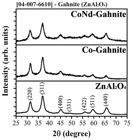 Figure 2 shows the X-ray diffraction patterns (XRD) of the three pigments synthesized ZnAl2O4, ZnAl2O4:Co, and ZnAl2O4:Co; Nd obtained after annealing in air at 1000 °C for 1 h. The synthesized pigments consist mainly of gahnite, ZnAl2O4 (ICDD card number 96-900-7024), with two prominent peaks appearing at 31.2° and 36.8°, which are associated with (220) and (311) the crystallographic planes. These are characteristics of a cubic crystal structure belonging to the spinel compounds with the general formula AB2O4, where A and B are predominantly zinc (Zn) and aluminum (Al), bi- and trivalent, respectively [,]. The diffraction peaks confirm that the calcination temperature of 1000 °C is suitable for obtaining monophasic gahnite pigments, which the substitution occurred in the tetrahedral sites occupied by Zn2+ ions; this process is favored by the similar ionic radii of IV-fold coordinated Co2+ and Zn2+, 0.58 Å and 0.60 Å, respectively []. Furthermore, XRD results showed that the amount of Nd ions inserted into the host lattice did not affect the gahnite phase. The XRD results indicated that 1000 °C is an optimum synthesis temperature to obtain a monophasic structure of ZnAl2O4 by the synthesis route proposed in this work.