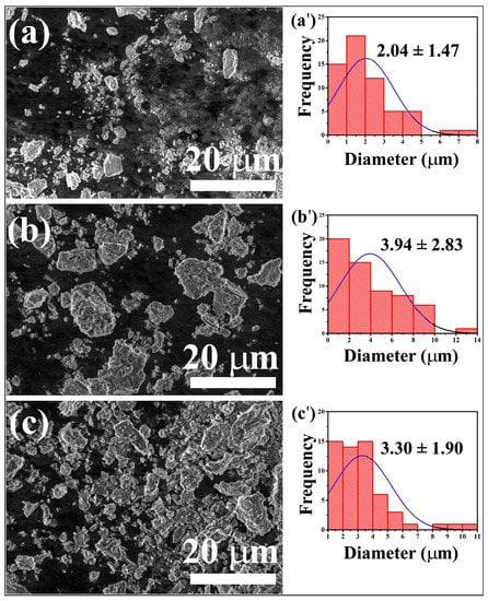SEM images of ZnAl2O4:M (M = Co2+ and Co2+/Nd3+) pigments: (a) ZnAl2O4, (b) Co-Gahnite, and (c) CoNd-Gahnite. The corresponding images (a′), (b′), and (c′) are related to the particle size aglomerates distribution histograms of the pigments.