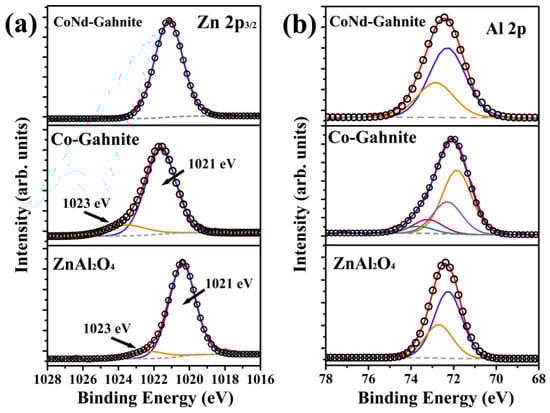 To study the electronic structure of the major elements, near-surface region, the high energy resolution photoelectron spectra of Zn 2p and Al 2p core levels are shown in Figure 4; the spectra were calibrated based on the reference peak of C 1s at 284.6 eV from carbon contamination. The Zn 2p3/2 XPS spectra were deconvoluted into two components, appearing in the range 1020–1021 eV and 1022–1023, assigned to the tetrahedrally (Td) and octahedrally (Oh) coordinated zinc [,], indicating that the Zn2+ ions occupy the site in an inverse spinel configuration in the ZnAl2O4 and Co-Gahnite pigments obtained. The ratio of the areas under these components suggests a higher percentage of inversion in Zn2+ site occupancy for the Co-Gahnite sample, whereas, for the pigment CoNd-Gahnite the Zn2+ ions are located in tetrahedral positions only (Figure 4a), denoting that the insertion of Nd ions into Gahnite structure reduces the distortion in the crystalline structure towards an inverse spinel. Similar results were observed by []. The XPS Al 2p core level spectra were fitted by the two components of the 2p doublet for the ZnAl2O4 and CoNd-Gahnite samples, indicating that the Al3+ ions occupy the inverted tetrahedral coordination site (Figure 4b) while for the Co-Gahnite two doublets used to fit the Al 2p peak indicating that Al3+ ions occupy more than one coordination site, i.e., the octahedral and the tetrahedral coordination site.