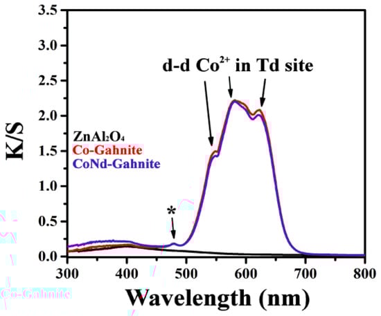 The K/S absorption spectra were recorded in the wavelength range of 300–800 nm to study the optical properties of the pigments (Figure 5). The graphic shows the triplet d-d band located at 548 (green region), 582 (yellow-orange region), and 622 nm (red region), which gives rise to the blue coloration []; this triplet is assigned to the 4A2(4F) → 4T1(4P) transition of tetrahedrally coordinated Co2+ ions [,,,], attributed to a Jahn-Teller distortion of the tetrahedral structure []. Thus, the pigments’ blue color is primarily due to this strong d–d transition of tetrahedral Co2+ between 500 and 675 nm. The low-intensity peaks around 478 nm (indicated in the image by the symbol *) are related to the spin-forbidden transition, which was attributed to transitions between octahedral and tetrahedral sites []; this peak was identified for similar material, Co-doped ZnAl2O4 obtained at 1000 °C [,]. The pigment-containing neodymium showed no changes in this spectrum region, with no significant decrease in the intensity of the absorption band around 500–650 nm.
