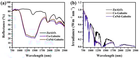 The Near Infrared spectra were also obtained for the pigments applied in waterborne acrylic paint to evaluate the performance of the pigments in a coating (Figure 7). The commercial paint used in this study contains the white pigment titanium dioxide, as observed in our previous work [], which can influence the NIR reflectance of the surface coatings due to its high solar reflectivity []. The NIR solar reflectance curves of the coatings were calculated by ASTM standard G173-03 (Figure 7b). As indicated in Table 3, there is a significant increase in R% for the pigment-containing Nd dispersed in paint, which produced a blue-colored pigment with almost 20% enhancement in NIR reflectance; this may be due to the CoNd-Gahnite pigment having a better dispersion of the particles compared to Co-Gahnite in acrylic-based paint, thus reducing the degree of agglomeration. The results indicate that synthetic pigments containing rare earth elements are promising for applying cool coatings.