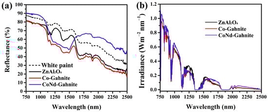 (a) Diffuse reflectance spectra of the synthesized pigments dispersed in white commercial paint; and (b) NIR solar reflectance spectrum of the coatings adjusted to the standard solar spectrum.
