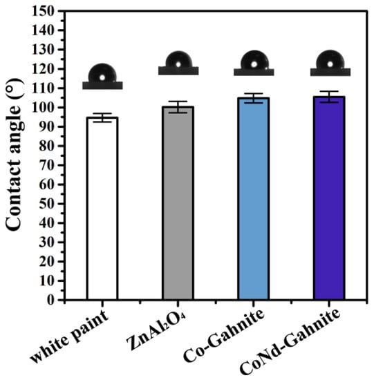 Self-cleaning infrared-reflective surfaces are required to prevent dust from adhering to the film coating and reducing infrared reflectivity [,,]. A solid surface’s coating properties can be measured simply by dropping water on the surface. Figure 8 shows the CA of the pigments coated in white commercial paint. Water wettability measurements results showed that the CAs of the coatings containing the synthesized pigments are all larger than 100°; the ZnAl2O4 coating surface had a CA of 100.2° ± 3.0°, while the commercial white paint showed a CA of 94.7° ± 2.2°. The surfaces containing the blue pigments increased the CA value, indicating a CA of 104.8° ± 2.4° and 105.5° ± 2.9° for Co-Gahnite and CoNd-Gahnite, respectively, showing that the insertion of rare earth in the composition can also improve the hydrophobic properties of the infrared-reflective surface. These preliminary results show that the coatings developed in this study, containing the synthesized blue pigments, exhibit a hydrophobic property. This enables them to keep the surface clean and maintain its reflective properties.