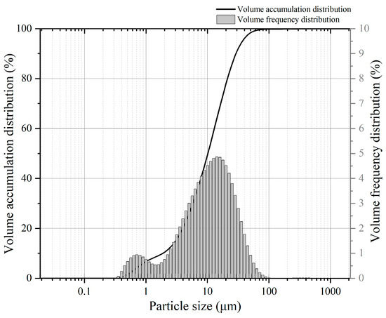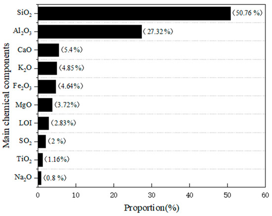 The fly ash used in the test is from Tianjin Zhucheng New Material Co., Ltd., Tianjin, China, with an average particle size of 1.201 μm. The main chemical components of fly ash are shown in Figure 1. The material photo and micrograph morphology are shown in Figure 2. The particle size distribution is shown in Figure 3. The fly ash is classified as Class F low calcium fly ash.
