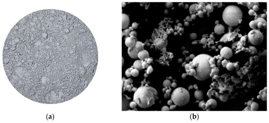 The photo of fly ash: (a) Photo of fly ash; (b) Micrograph of fly ash.