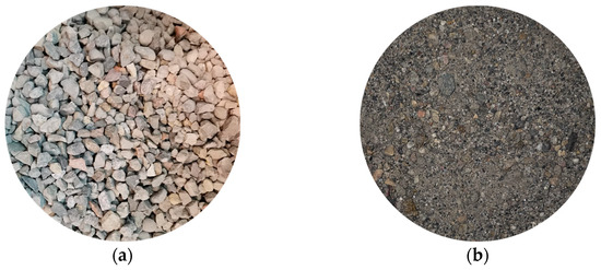 The recycled coarse aggregate comes from the concrete after crushing and screening and is selected as 5~20 mm continuous grading. The performance parameters are shown in Table 1. According to the specification for recycled coarse aggregate for concrete (GB/T 25177-2010), it belongs to class II recycled aggregate. The fine aggregate is river sand with a fineness modulus of 2.3, and the maximum particle size is 4 mm. The photo of the recycled coarse aggregate and fine aggregate is shown in Figure 4.