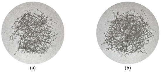 The density of POM fiber is 1.42 g·cm−3, the tensile strength is 800 MPa, the modulus of elasticity is 10 GPa, the elongation at break is 30%, the diameter is 0.2 mm, and the length is 6 mm and 12 mm. The photo of POM fiber is shown in Figure 5. In this test, the mixing volumes of the two lengths of POM fiber are 0%, 0.25%, 0.50%, 0.75%, and 1.00%, respectively. Therefore, the test group number is length-volume; for example, 6-0 represents the length of POM fiber as 6 mm and the corresponding volume content as 0%.