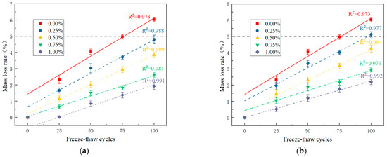 Fitting curve of mass loss rate of PRGRC with the number of freeze-thaw cycles: (a) 6 mm POM fiber; (b) 12 mm POM fiber.