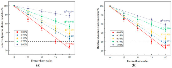 Fitting curve of relative dynamic elastic modulus of PRGRC with the number of freeze-thaw cycles: (a) 6 mm POM fiber; (b) 12 mm POM fiber.