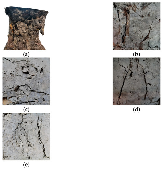 Compressive failure pictures of PRGRC with different fiber volume contents under 100 freeze-thaw cycles: (a) 0%; (b) 0.25%; (c) 0.50%; (d) 0.75%; (e) 1.00%.