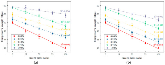 Fitting curve of the compressive strength of PRGRC with the number of freeze-thaw cycles: (a) 6 mm POM fiber; (b) 12 mm POM fiber.