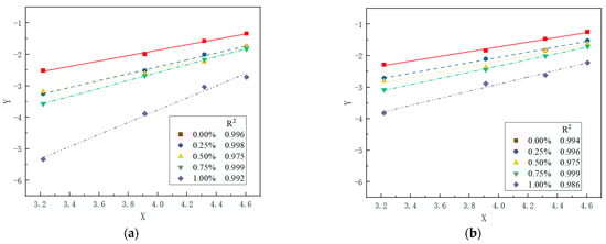 According to the test data of the compressive strength of PRGRC with different fiber lengths and volume contents under the freeze-thaw cycle, Equation (4) is linearly fitted, as shown in Figure 10. The linear regression parameters are shown in Table 3, and the correlation coefficient R2 is above 0.97, which indicates that the compressive strength of PRGRC with different POM fiber lengths and volume contents under the freeze-thaw cycle is highly fitted with the model.