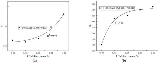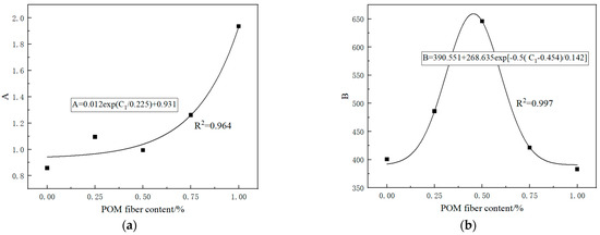 Fitting curve between volume content of 12 mm POM fiber and parameters A and B: (a) Parameter A; (b) Parameter B.