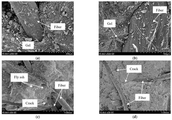 Figure 13 is the microstructure of PRGRC under the scanning electron microscope (SEM), which can effectively observe the fiber interfacial transition zone (FITZ) between fiber and concrete so as to analyze the interaction between POM fiber and GRC, including the embedded distribution of fiber, the control effect of fiber on the concrete cracks, etc. [35]. From Figure 13a,b, it can be seen that the connection between a single POM fiber and concrete is good, and the POM fiber is tightly embedded in the concrete matrix, indicating that the POM fiber and concrete have good compatibility, which is conducive to the improvement of the performance of POM fiber on concrete matrix. From Figure 13c,d, it can be seen that many POM fibers form a network structure in the concrete matrix, which plays a role in the densification and reinforcement of the concrete matrix structure while inhibiting the shrinkage effect of the concrete itself, thus improving the strength and providing strong support for the subsequent concrete matrix to reduce damage in the freeze-thaw cycle.