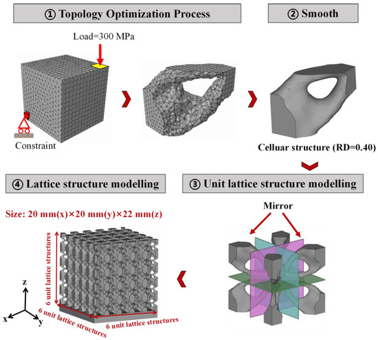 - Topology optimization process. Consistent with our previous work [27,29], the cellular structures here were 3D-modeled by the optimization of a cube based on the topology optimization module of ABAQUS software. Material parameters modules were set corresponding to the mechanical properties of 316L stainless steel: the elastic modulus was 187 GPa and Poisson’s ratio was 0.33. The step module was set as the procedure type of “Static/General”. The vertex element of cube at the top right corner was subjected to the load (300 MPa, as this value cannot exceed the yield strength of 316L stainless steel, which is approximately 529 MPa), while its diagonal opposite vertex element was fixed completely. The RD of the objective model were constrained to 0.5, 0.4, 0.3, 0.2, and 0.10 of the original cube. After finishing this process, the 3D models of optimized cellular structures can therefore be output as .STL documents for further SLM fabrication.