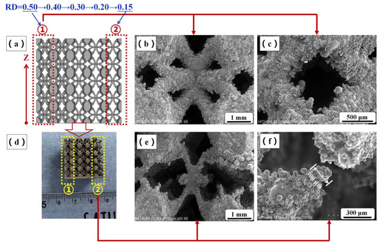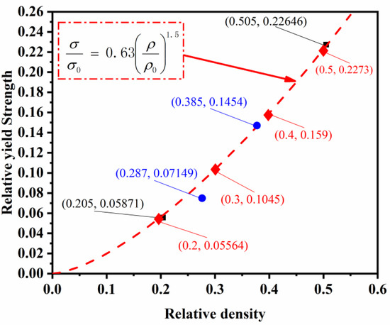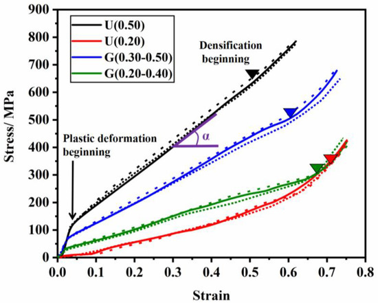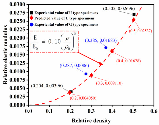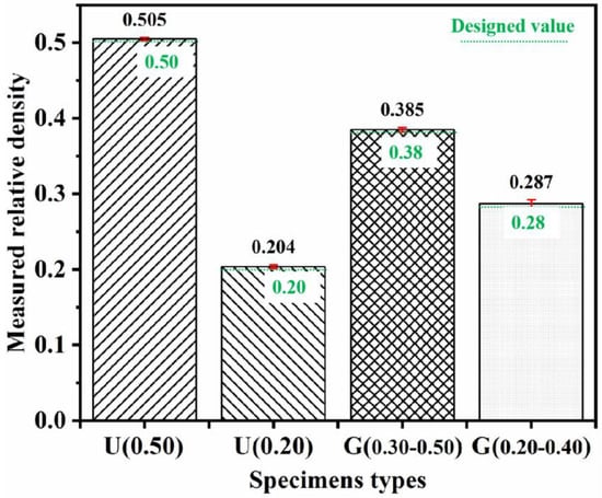 - Both the elastic modulus and the yield strength of specimens decreased with the lessening of the RD value. For ULSs, U(0.50) possessed the mechanical properties (E = 5.042 ± 0.050 GPa, σy = 120.241 ± 0.283 MPa), and U(0.20) possessed the mechanical properties (E = 0.74 ± 0.013 GPa, σy = 29.433 ± 0.802 MPa). For FGLSs, G(0.30–0.50) possessed the mechanical properties (E = 3.148 ± 0.055 GPa, σy = 76.924 ± 0.401 MPa), G(0.30–0.50) possessed the mechanical properties (E = 1.609 ± 0.020 GPa, σy = 37.820 ± 0.705 MPa).