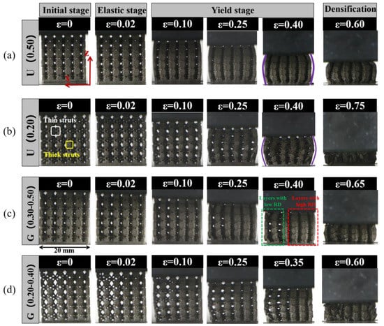 - The stress-strain curves of all specimens followed that of the elastomeric foam mode, indicating that the designed structures had a strong resistance to deformation. ULSs had a uniform deformation behavior with bending and bulking of struts in different layers, while FGLSs specimens displayed a significant difference in deformation mechanism compared with ULSs, presenting a mixed deformation behavior in different layers.