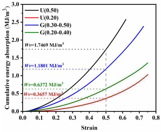 - The energy absorption capability (Wv) of specimens was proportional to their RD value. When the value of RD increased from 0.20 to 0.50, the Wv of ULSs increased from 0.3657 to 1.7469 MJ/m3. When the average value of RD increased from 0.287 to 0.385, the Wv of FGLSs changed from 0.6372 to 1.1801 MJ/m3. This can be explained by the fact that lattice structures with higher RD value have thicker struts, which can bear larger stress.