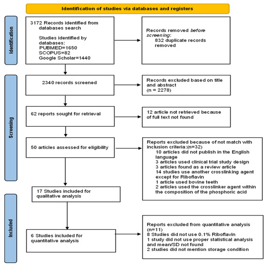 From all three databases (PubMed, Scopus, Google Scholar), a total of 3172 papers were retrieved. A total of 2340 documents were reviewed after the duplicates had been removed by reading the title and abstract. A total of 2278 articles were subsequently eliminated because they failed to meet the criteria for inclusion, leaving 62 items in total for full-text reading evaluation. Of these articles, for 12 studies, full texts could not be retrieved. In total, 50 articles were assessed for eligibility, but among them, 33 were not considered in the qualitative analysis because, among the 10 studies published in different languages except for the English language, 3 studies used clinical trial study design, 3 studies were found as a review article, 14 studies used another crosslinking agent except for riboflavin, 1 article used bovine teeth, and 2 articles used the crosslinker agent within the composition of the phosphoric acid.
