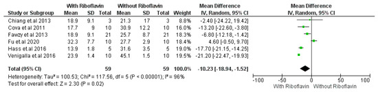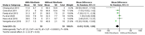 Forest plot of micro tensile strength property of adhesive with 0.1% RF crosslinker. Metaanalysis was conducted with six studies. The meta-analysis evaluated the micro tensile bond strength of the dentin bonding system with and without the use of riboflavin [18,23,26,30,31,32] after prolonged (6 months) storage.
