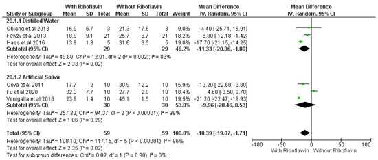 In Figure 2, micro tensile bond strength without the use of 0.1% riboflavin was considered as control group and micro tensile strength with the use of riboflavin was used as study group. Micro tensile strength shows significant improvement with the addition of riboflavin (p < 0.05) compared to without the addition of riboflavin from with 95% CI. A significant difference has been found in micro tensile bond strength between use of the RF crosslinker and without use of the RF crosslinker in the dentin adhesive system. With a 95% confidence interval (CI), the I2 for micro tensile strength was 89% with strong heterogeneity, Chi2 = 44.76, df = 5 (p < 0.00001), and overall effect size is Z = 2.22 (p = 0.03). Chiang et al. 2013 shows maximum mean differences which is 38.50 [17.93–59.07] in micro tensile bond strength among all the studies after adding RF crosslinker in the dentin–resin bonding after 24 h aging. However, Fu et al. 2020 [26] and Hass et al. 2016 [31] showed negative changes in in micro tensile bond strength after adding RF crosslinker in the dentin–resin bonding. Except these two studies, other studies (Chiang et al. 2013, Cova et al. 2011, Fawzy et al. 2013, and Venigalla et al. 2016) [18,23,30,32] improvement in microtensile bond strength after incorporating RF collagen crosslinker in the adhesive system. Pooled effect of six studies showed positive increase in microtensile bond strength after RF use.