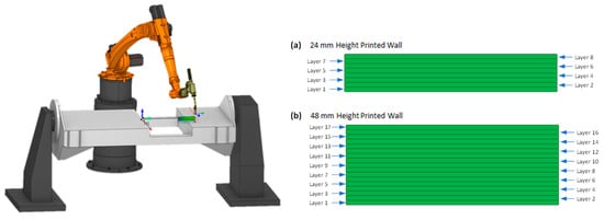 Robotic WAAM cell with the zig-zag deposition path strategy used in the printing for the walls with (a) 24 mm height, and (b) 48 mm height.