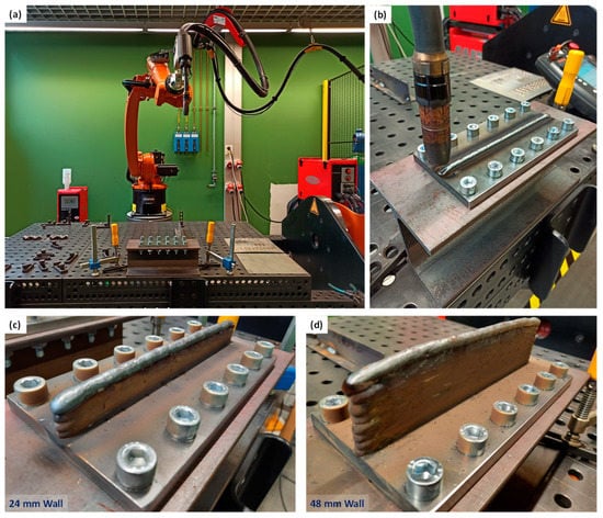 (a) WAAM set-up at the Belgian Welding Institute, (b) a closer view showing the printing process (after deposition of a single bead layer) on a substrate clamped on an H-profile, which is clamped on the table. Printed wall specimens with two different heights: (c) 24 mm, and (d) 48 mm.