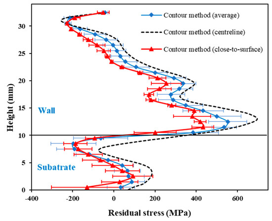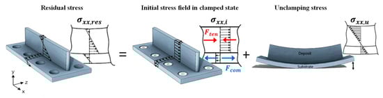 Figure 3 illustrates the distribution of the longitudinal component of residual stress in a WAAM part. If the substrate is clamped rigidly during printing, the residual stress is the summation of the initial stress field before unclamping and the deformation-induced stress field resulting from unclamping , which can be expressed by Equation (1) [5,13,57,58], where the term can be assumed or measured experimentally; can be obtained by DIC-monitored unclamping. Equation (1) is schematically represented in Figure 3.