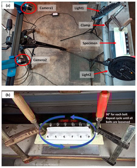 (a) Set-up for DIC-monitored unclamping, (b) Procedure followed to unscrew the bolts gradually.