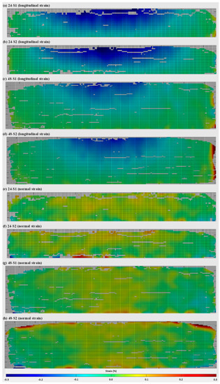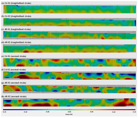 Two-dimensional strain distributions on the substrate fronts captured during DIC-aided unclamping: (a–d) longitudinal strains, (e–h) normal strains. (a,b,e,f) represent the 24 mm wall, and (c,d,g,h) represent the 48 mm walls; S1 and S2 represent two repeating tests.