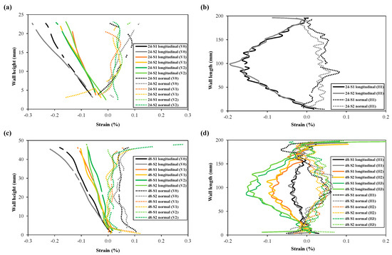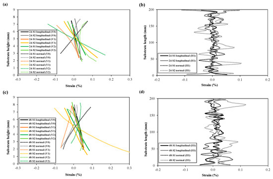 Comparison of longitudinal and normal strains on the substrate fronts extracted from different regions (lines) with 24 mm walls (a,b), and 48 mm walls (c,d); (a,c) represents strain along the wall height and (b,d) strain along the wall or substrate length. (Line numbers can be found in Figure 7).