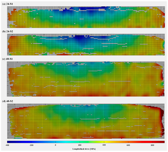 The final longitudinal residual stresses calculated from DIC results are presented in Figure 12 (wall front) and Figure 13 (substrate front), using Equation (1). Similar to the strain fields obtained after DIC-aided unclamping (Section 3.1), residual stresses were found to be compressive at the top centre of the WAAM walls, gradually changing to tensile towards the substrate as well as on the right and left edges of the walls. In other words, unclamping causes distortion and redistribution of the stresses in such a way that there is a uniform gradient from compressive residual stresses of a semi-elliptical pattern (at the top centre of walls) to tensile residual stresses (towards the substrate and wall side edges). The compressive and tensile stresses along the height of the walls can be explained by the fact that the highest layers are deposited later on. The bottom layers have already cooled down and shrunk a bit when a new hot layer is added on top. As this new layer cools down, shrinkage is restrained by the underlying layer, causing the part to distort [62]. Residual stress results for wall fronts also demonstrated the repeatability in residual stress measurements for both wall heights (specimens S1 and S2). Regarding the longitudinal stresses in the substrate fronts, the lower half of the substrate contains tensile stress and the upper half contains compressive stress. The tensile and compressive stresses are, however, present in the form of clusters rather than a continuous distribution along substrate length. Therefore, the reliability of the substrate results may be questioned. When comparing the evolution of longitudinal residual stresses for the 24 mm and 48 mm walls, it was observed that the 24 mm wall specimens possess higher magnitude compressive residual stresses at the top of the wall, because the shorter walls deform more due to their lower cross-sectional stiffness. On the other hand, the 48 mm wall specimens reach higher tensile stresses in the wall close to the substrate due to the higher restraint from the substrate.