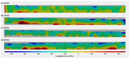 Longitudinal residual stresses in the substrate fronts with wall heights 24 mm (a,b) and 48 mm (c,d): S1 and S2 are repeating tests for each wall height.