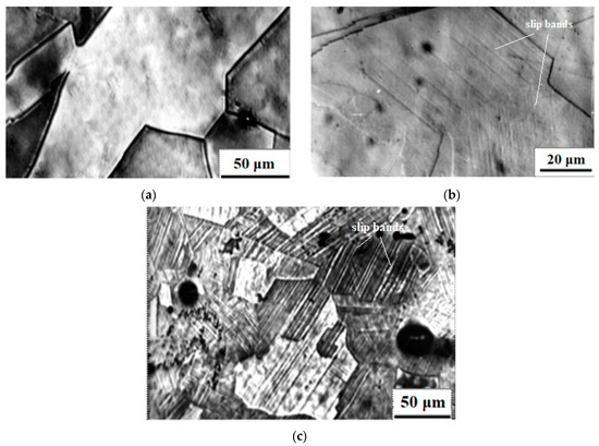 Before deformation, the steel microstructure is represented by grains with an average grain size of 150 μm without carbides at the boundaries and without slip bands inside the grains (Figure 2a). Upon reaching the degree of tensile deformation of 5%, slip bands appear inside individual grains (Figure 2b), and upon tensile deformation of 20%, the number of slip bands increases, being observed in all grains, but the grains are still not elongated along the direction of deformation (Figure 2c).