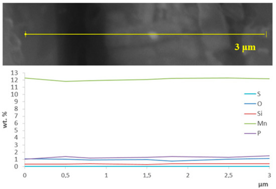 The steel structure before deformation is homogeneous austenitic and the results of the EDX analysis of the distribution of elements in the selected direction (Figure 3) do not show any noticeable deviations from the steel composition indicated in Table 1. This confirms the homogeneity of the structure and absence of carbides at the boundaries observed by optic microscopy (Figure 2a).