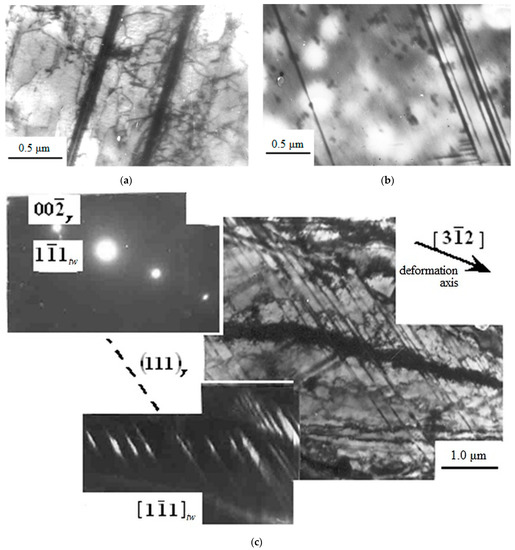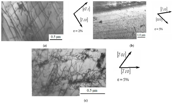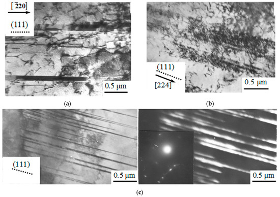 The presence of regions with a predominance of long dislocations elongated along one or two <110> directions is typical for tensile deformation with ε < 5% (Figure 4a). These dislocations accumulate and form tangles, which are still weakly expressed at the initial degrees of plastic deformation. With an increase in the degree of deformation to 5%, single-layer stacking faults (Figure 4b) and tangles of dislocations (Figure 4c) appear in the structure.
