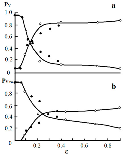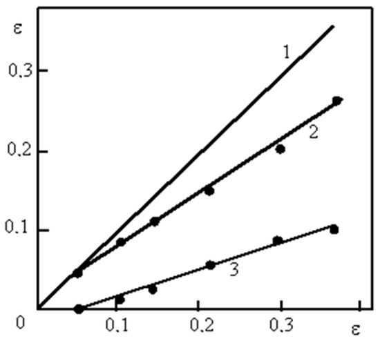 Figure 6 shows the dependences of the experimentally determined twin area fractions of the material covered by sliding (Pv) and twinning (Pvtw) (Figure 6a), as well as the dependence of the number of twins developing in systems 1, 2, and 3 (Figure 6b) on the degree of deformation both by tension and rolling.