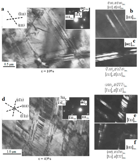 TEM micrographs of intersecting systems of microtwins in Hadfield steel after deformation (ε = 10%): the bright field—with electron diffraction pattern, where the arrows show the reflections of the γ-matrix and twins (a); the dark field is obtained in the reflections of twins [111] (b) and [002] (c); after deformation with ε = 43%, the bright field—with electron diffraction pattern (d), the dark field is obtained in the reflections of twins [] (e) and [111] (f).