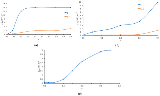 Dependences of scalar ρ and excess ρ± dislocation density at rolling deformation (a), at tensile deformation (b) and ρtw (c) on the plastic deformation degree in Hadfield steel.
