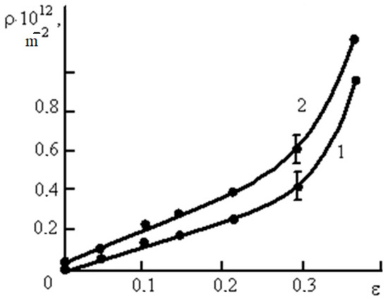 Dependence of the scalar dislocation density on the degree of plastic deformation of Hadfield steel for grains containing microtwins (curve 1) and for grains without microtwins (curve 2).