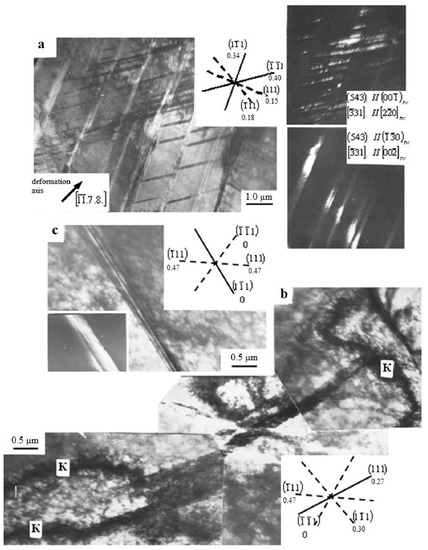 TEM micrographs of the microstructure of Hadfield steel deformed with ε = 25%: (a) samples after tension; (b,c) cold-rolled samples with an indication of the values of the Schmid factors, operating (solid line) and non-operating (dotted line) twinning systems, as well as extinction contour K.