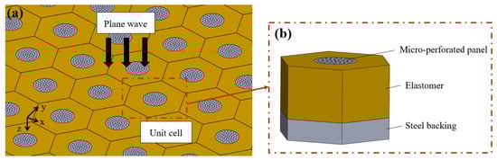 Schematic of developed hybrid sound-absorbing metastructure: (a) configuration and problem description and (b) unit cell of the metastructure.
