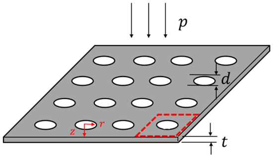 Figure 3 displays an MPP that can be regarded as a parallel arrangement of many thin-plate units with circular openings. One unit is marked by a red dashed box in the figure. Because of the small diameter of the cylindrical openings of the MPP, the influence of the viscous boundary layer must be considered.