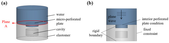 To verify the theoretical results, we used COMSOL Multiphysics to conduct finite-element simulations. The three-dimensional model used for the finite-element simulations is displayed in Figure 5a. The acoustic–solid coupling module of the aforementioned software was adopted to estimate the sound absorption coefficient of the developed hybrid sound-absorbing metastructure. The elastic material domain was simulated using the elastic waves component, and the air in the internal cavity and the external water were simulated using the pressure acoustics component. The average sound pressure and axial velocity in plane A were evaluated to calculate the sound absorption coefficient. However, because of the thermal viscous dissipation of the MPP, the thickness of the boundary layer had to be considered in the finite-element software, which resulted in a high calculation cost. Therefore, internal perforated conditions were used in this study to model the MPP, and the fluid in the MPP was set as water. Rigid boundaries were set at the bottom of the metastructure and the outer boundary of the water-filled cavity. Moreover, the radial displacement field of the outer boundary of the elastomer was defined as a fixed constraint. Plane sound waves were incident from above the hybrid metastructure, as depicted in Figure 5b.