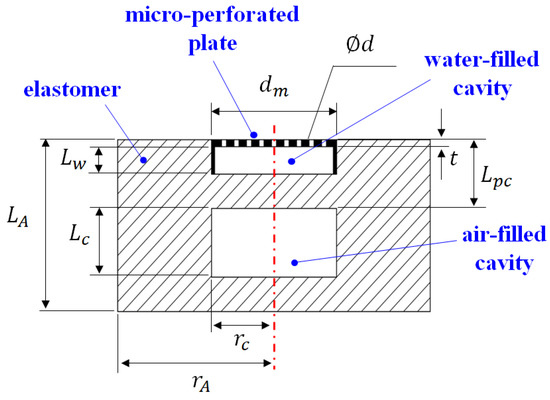 Figure 1a shows a schematic of the developed hybrid sound-absorbing metastructure containing periodically arranged cavities. As displayed in Figure 1b, each unit of the developed hybrid metastructure comprises an elastomer and MPP. The MPP is composed of a highly rigid material with cavities filled with water. The elastomer is viscoelastic with cavities filled with air. The steel backing of this metastructure is considered a rigid wall; thus, all sound waves are assumed to be reflected back from the bottom of the metastructure. Because the overall structure includes cylindrical cavities with discontinuous cross-sectional areas and MPPs, the integrated transfer matrix (ITM) method was used to analyze the structure [6]. In this method, the overall metastructure is divided into numerous sections, and a transfer matrix that relates the variables of the incidence and terminal surfaces is generated for each section. Finally, the transfer matrix of each section is combined with the boundary conditions between the sections to obtain the final transfer matrix.