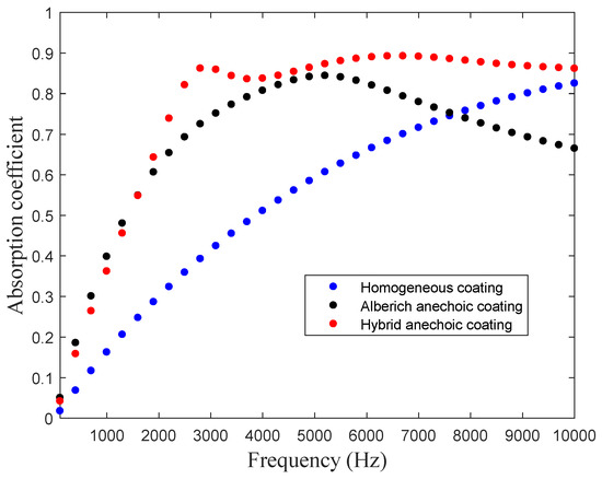 Before employing the comparison of the theoretical and simulated absorption coefficients, it is necessary to understand the influence of metastructure without MPP on the sound absorption. Figure 7 displays the absorption coefficient profile of the anechoic structure with cavities. A sound-absorbing peak appears because of the resonant effect. The absorption coefficient peak of the typical Alberich anechoic coating structure with cylinder cavity [22] appears at 5.2 kHz in the simulations. The anechoic structure has an improved absorption performance at the low-frequency region when combined with the microporous plate, and the original sound absorption peak moves to the high-frequency region. Moreover, the sound absorption coefficient of the hybrid anechoic structure can reach more than 0.8 in the broadband range applied by sonar, which has a fairly good sound absorption effect.